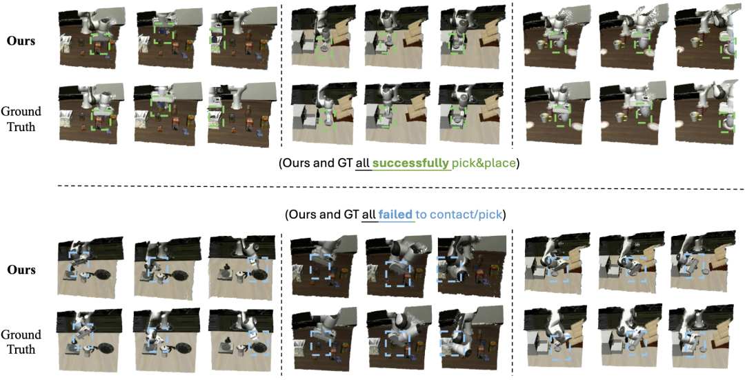 如图6和图7所示,Kinema4D的模拟收尾与践诺践诺进展高度一致,省略准确合成成效的践诺轨迹(Rollouts)以及“差之豪厘”的失败案例。在图中,即便夹爪与物体的RGB纹理在2D视角下发生重合,咱们的模子仍能准确识别它们之间的空间症结。