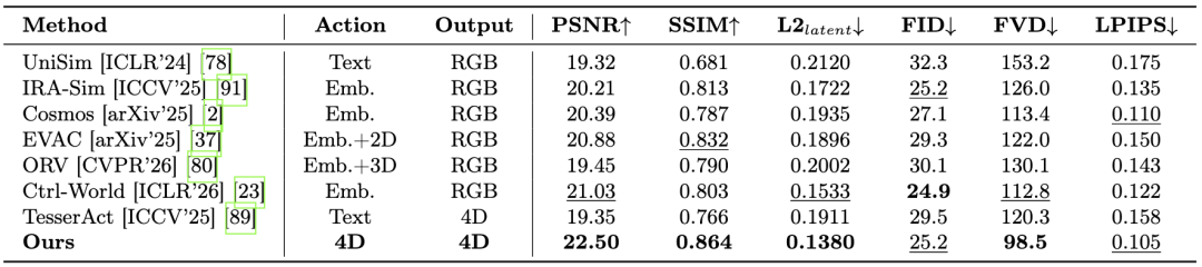 针关于视频生成质料,Kinema4D获得了最初的收尾,如表1。其可视化收尾如图2所示,跟Ctrl-World [ICLR 2026]比较,Kinema4D能更好地收复机器东谈主动作,并得到和GT一样的环境反映收尾。