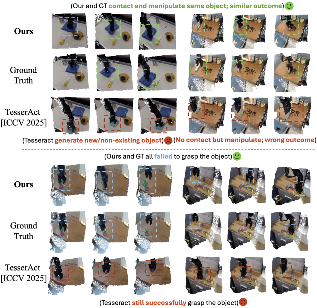 针关于几何质料,比较于近期的另一个4D生成式模拟器(TesserAct [ICCV 2025]),Kinema4D也获得了更好的效率,如表2。其可视化收尾如图3所示,Kinema4D省略精准收复真确轨迹(Ground-Truth)的践诺效率,包括“差之豪厘”的机器东谈主任务失败的案例。举例,在左下角的示例中,即便夹爪与植物在2D视角下的RGB纹剃头生重复,Kinema4D仍能准确识别它们之间的空间症结,从而准确模拟出机械臂未能持取植物的收尾。