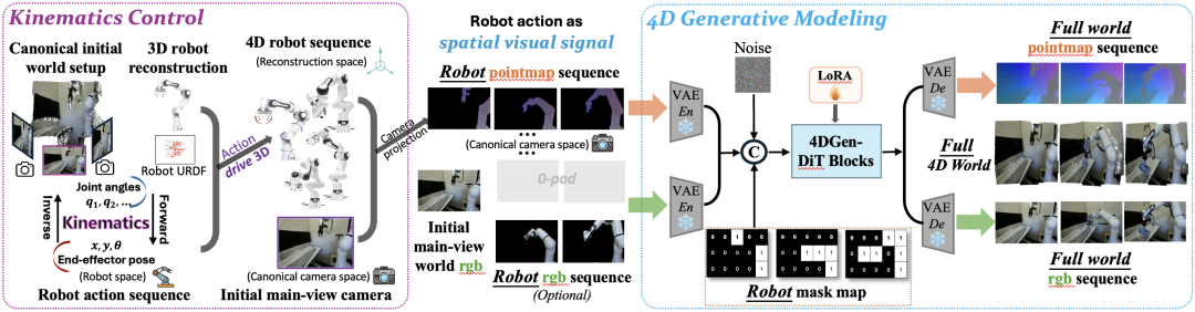i)畅通学驱动的精准4D动作表征:机器东谈主动作在4D空间中具有物理确定性,不应由生成模子“预测”或“臆测”。笼统的枢纽角或位姿序列惟有映射到物理结构上才具备真理。因此,Kinema4D愚弄3D重建的URDF模子,通过显式畅通学产生一语气且物理准确的4D轨迹,为交互提供高粒度的时空因果驱动。