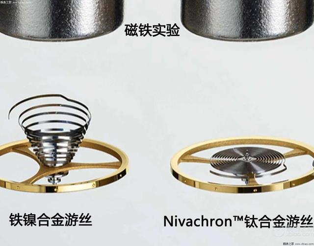 上图左侧的铁镍合金游丝受到磁铁的影响,而同等气象下的右侧Nivachron™钛合金游丝就不受影响